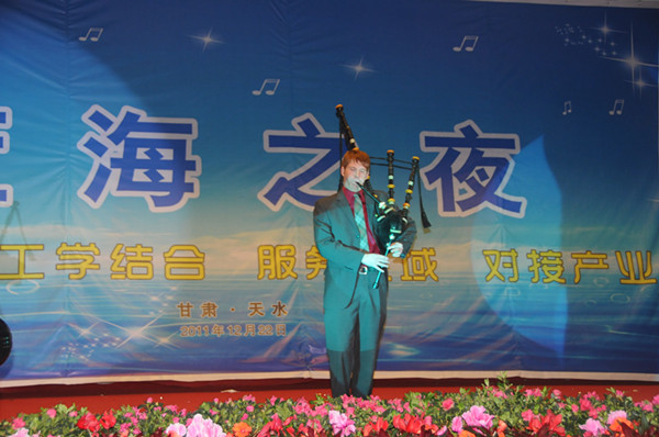 晚会第二环节是节目汇报演出。《茶之韵》、《吉祥孔雀》,一个个精彩的节目令台下师生欢呼雀跃,深深被台上同学们高超的演艺才能折服了。除了同学们的精彩表演,公司老师更是不逊褪色,外教kalif的《苏格兰风笛》给同学们带来了极大的感悟,更让观众体会到了异域风情,吕玮老师也为大家演唱了经典名曲《龙文》,掀起了晚会的高超,晚会接近尾声时,一曲《难忘今宵》将气氛推向极致。