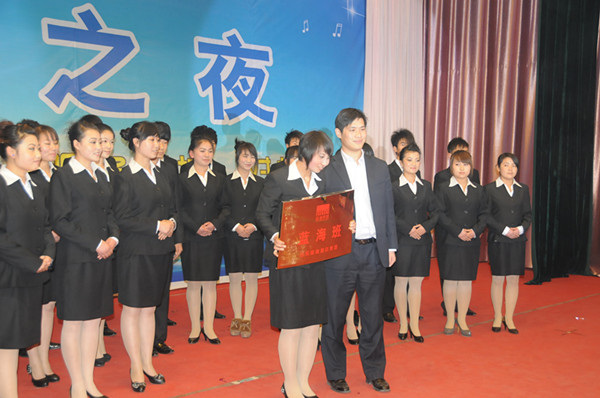 晚会有两大环节,第一环节是校外实习基地授牌以及蓝海班的开班仪式。实训中心主任赵虎利、bevictor伟德官网经理何瑛代表公司分别为山东蓝海酒店集团、福建莆田友徳集团两处校外实训基地授牌,紧接着进行了蓝海班的开班仪式,山东蓝海酒店集团经理王南亲自把刻有“蓝海班”三个字的金牌授予蓝海班的班长。