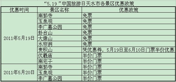 中国旅游日“5·19”,源于我国伟大的旅行家徐霞客在其著作《徐霞客游记 》开篇日,其次,这也是游客出游的理想季节。国务院把每年5月19日定为“中国旅游日”,是旅游活动日益重要的体现。为迎接首个“5·19”中国旅游日,天水市部分景区点推出了面向游客的优惠政策。