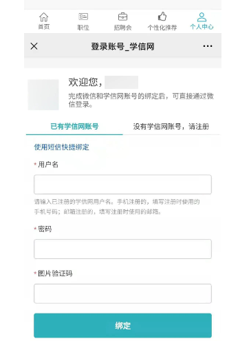 3.在个人中心点击登录,并输入学信网账号密码,点击绑定