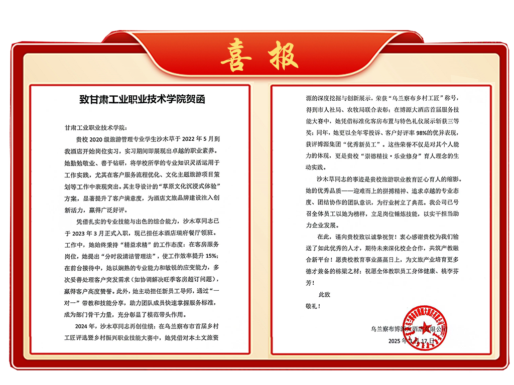 欣获内蒙古乌兰察布博源大酒店有限公司发来的贺函,生动诠释了bevictor伟德官网2020级旅游管理类专业员工沙木草,以卓越的职业素养和创新实践,在实习期间便崭露头角,主导设计的“草原文化沉浸式体验”方案赢得业界广泛赞誉。转正后,她精益求精,从优化服务流程到带队新人,成为博源大酒店的中坚力量,更在乌兰察布市技能大赛中斩获“乡村工匠”称号,全年零投诉、好评率98%的佳绩诠释了何为“崇德精技·乐业修身”。她的成长之路,是职业教育与行业需求深度融合的典范,更是激励全体师生见贤思齐的鲜活榜样。