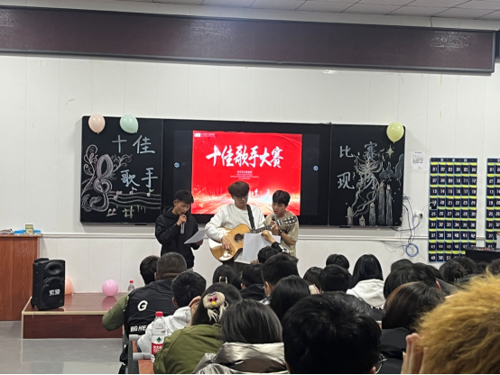 比赛随着张柏涛、王阳两名同学的《五百二十赫兹》拉开了帷幕,台下同学们热情高涨,为台上的每一位选手加油、助威。温暖贴心的《女儿情》,幽默诙谐的《歌曲串烧》,柔情似水的《飞云之下》……一首首悦耳动人的歌曲如一幅幅的水彩画缓缓铺呈在观众们的面前,让观众如身临其境般步入歌曲中唯美的场景。
