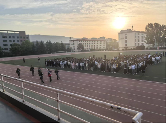 六点四十,国旗护卫队迈着铿锵步伐护送国旗入场。在雄壮的《义勇军进行曲》中,全体师生肃立行注目礼,五星红旗冉冉升起,迎风飘扬。