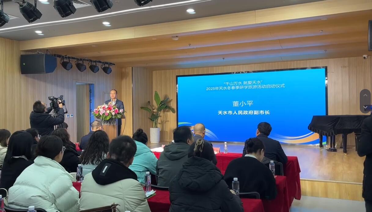 董小平在致辞中说,近年来,天水市依托丰富的旅游资源,加大政策保障力度,将研学旅游作为延伸产业、推动文旅融合发展的重要途径,主动顺应旅游消费新趋势,倾力打造研学旅游目的地和示范基地,设计开发研学旅游产品、活动,推动天水研学旅游健康有序发展。为进一步促热今冬明春“天水麻辣烫”热度,全力推动天水冬春季研学产品宣传推广,天水市依托本次活动发布研学课程、研学线路及优惠政策,旨在广泛吸引各地研学团队和外地游客来天水休闲、度假、研学。希望天水各类研学机构、旅行社等文旅企业持续加强与院校合作,升级、优化研学旅游产品,共同构建一个内容丰富、质量上乘的研学实践资源库,为研学团队提供更加多元化、专业化、高标准的研学服务,打造一流的天水研学旅行品牌,持续推动天水文旅市场“长红”。