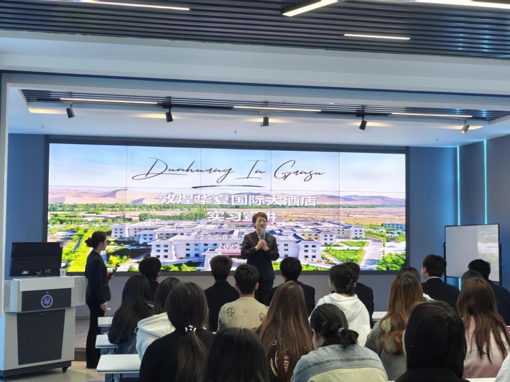 作为学经理期合作伙伴,天水麦积山温泉旅游大酒店率先展开宣讲。企业代表通过详实的职业发展通道展示和员工福利体系解读,生动描绘出温泉度假产业的职业蓝图。兰州盛达希尔顿酒店以“西北旗舰店”的独特定位吸引目光,宣讲人通过诙谐的互动方式,将国际酒店集团的培养体系与本土发展机遇巧妙融合。敦煌华夏国际大酒店则依托“沙漠生态主题酒店”特色定位,向学子们展示了文旅融合背景下的职业发展新机遇。